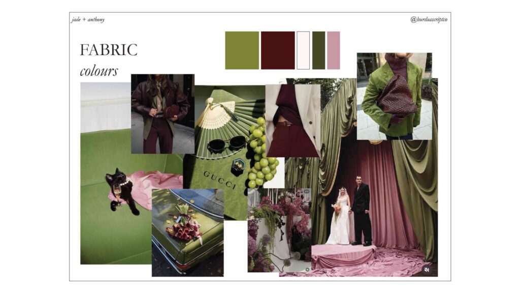 Jade’s vision was anchored in a palette of deep burgundy, forest olive, pistachio and warm blush; a colour story drawn from the season’s best offerings and the richness of the land itself. She was drawn to bold, structural, textural design with a sense of abundance that felt organic rather than orchestrated. She communicated it precisely, and then trusted me completely to find its best possible expression.
