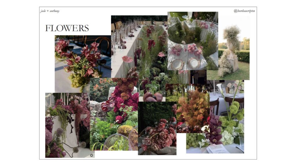 The mood boards you can see above are what she brought to me at the very beginning: her references, her instincts, her vision. And what followed; the refined palette, the botanical choices, the way the whole day ultimately looked and felt, is what we developed together from there.