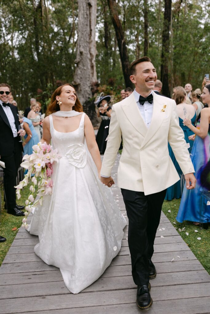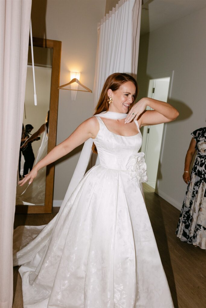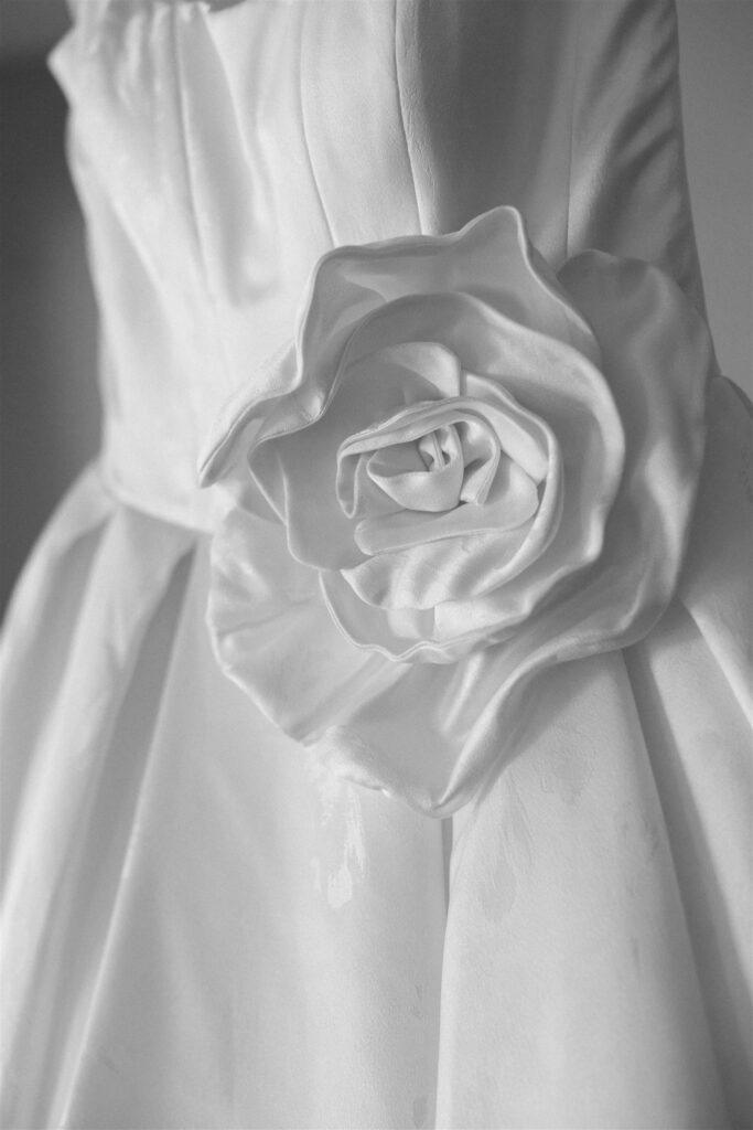 Jade’s gown was, in many ways, its own design document. A structured Pronovias ballgown in floral-jacquard silk; the botanical pattern woven directly into the fabric in tone-on-tone white, with an oversized satin rose at the waist that was simultaneously sculptural and romantic.