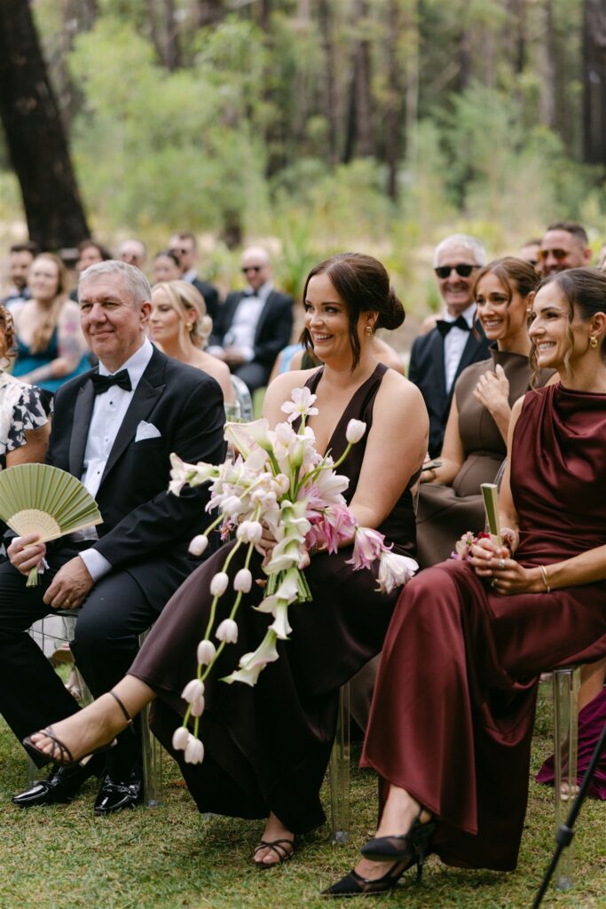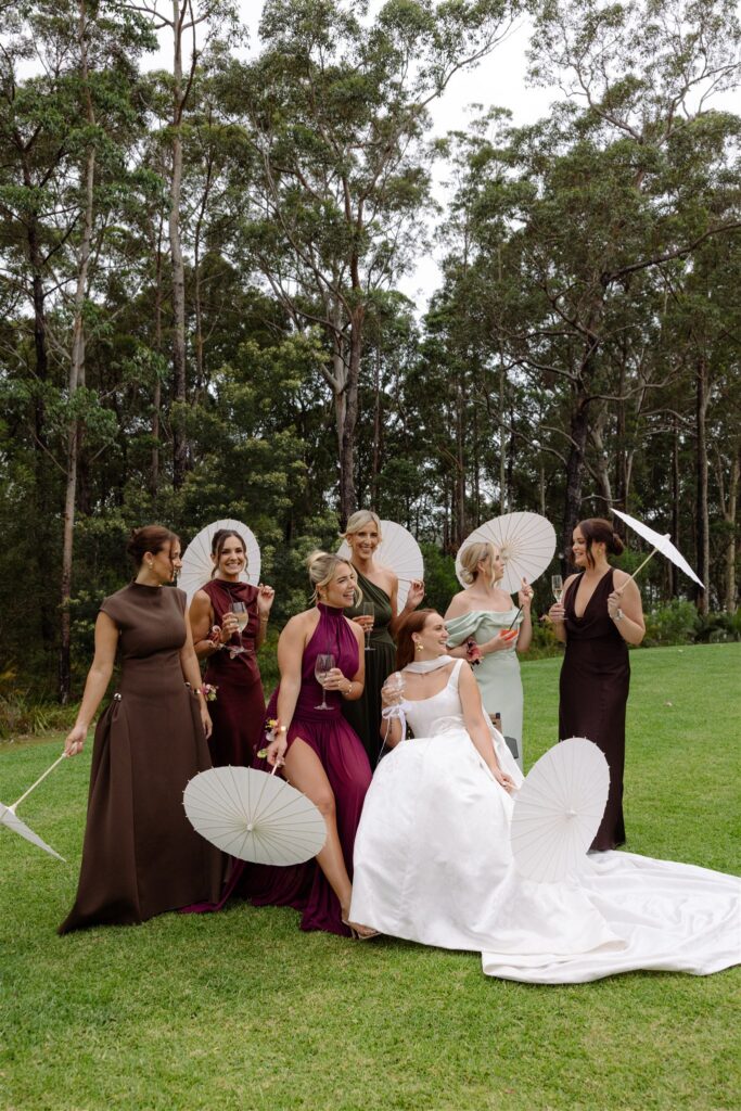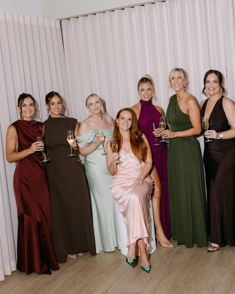 The bridesmaids’ dresses were not an afterthought; they were a continuation of the colour story. Plum, sage, chocolate, olive, burgundy: each bridesmaid in a different hue, each dress a different silhouette, and yet together they read as a single, cohesive palette that mirrored the botanicals almost exactly.
