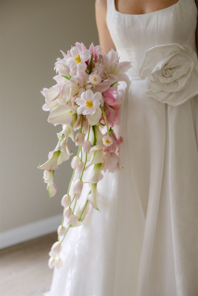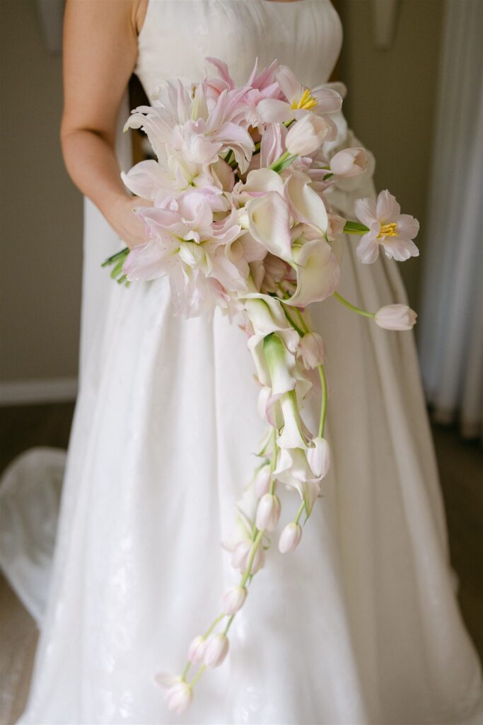 What Jade carried was a cascading waterfall bouquet: blush tulips, pink rose lilies, and blush calla lilies falling long and loose from her hands in the most unhurried, unstructured way.