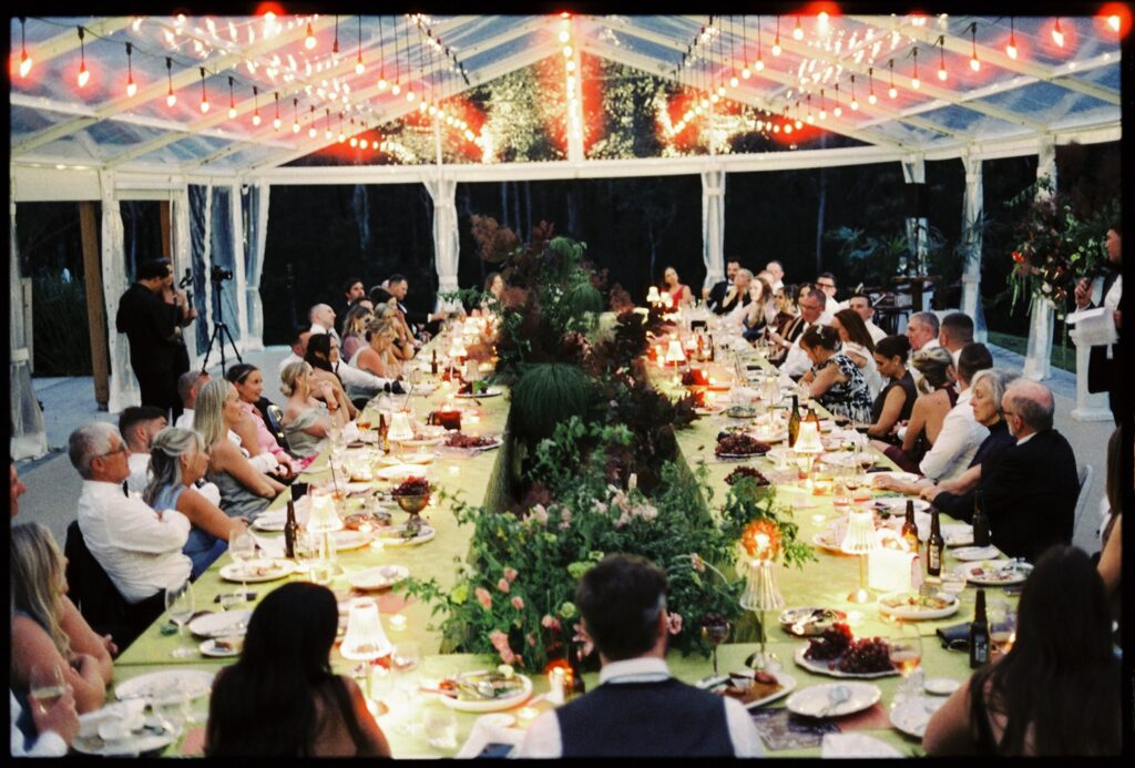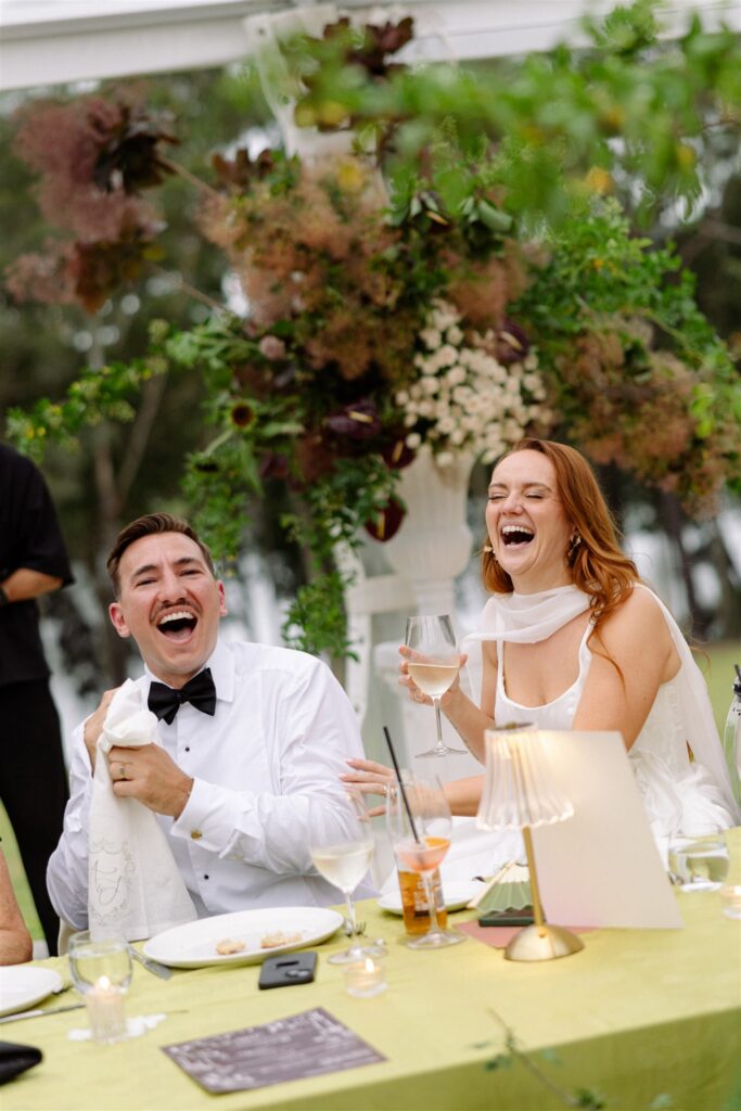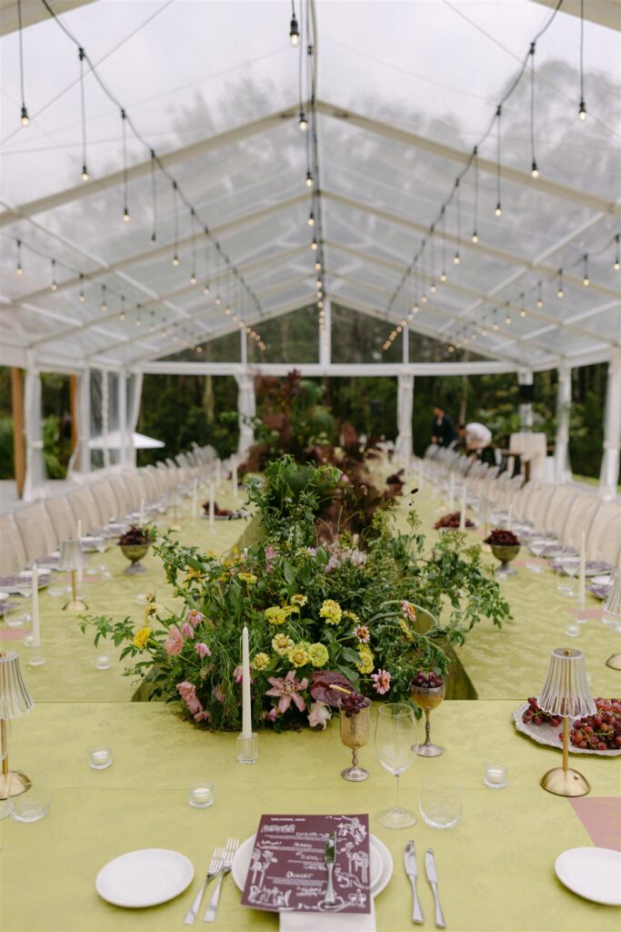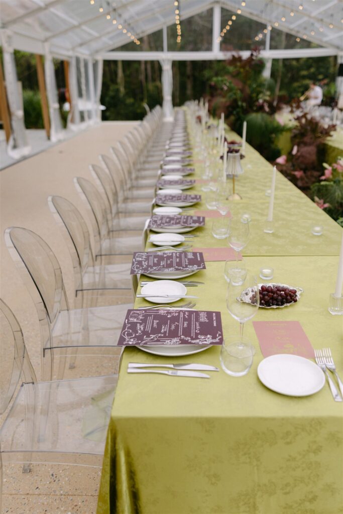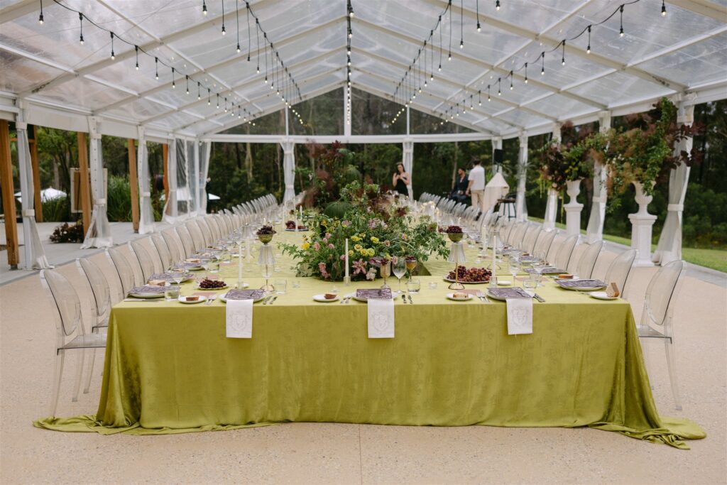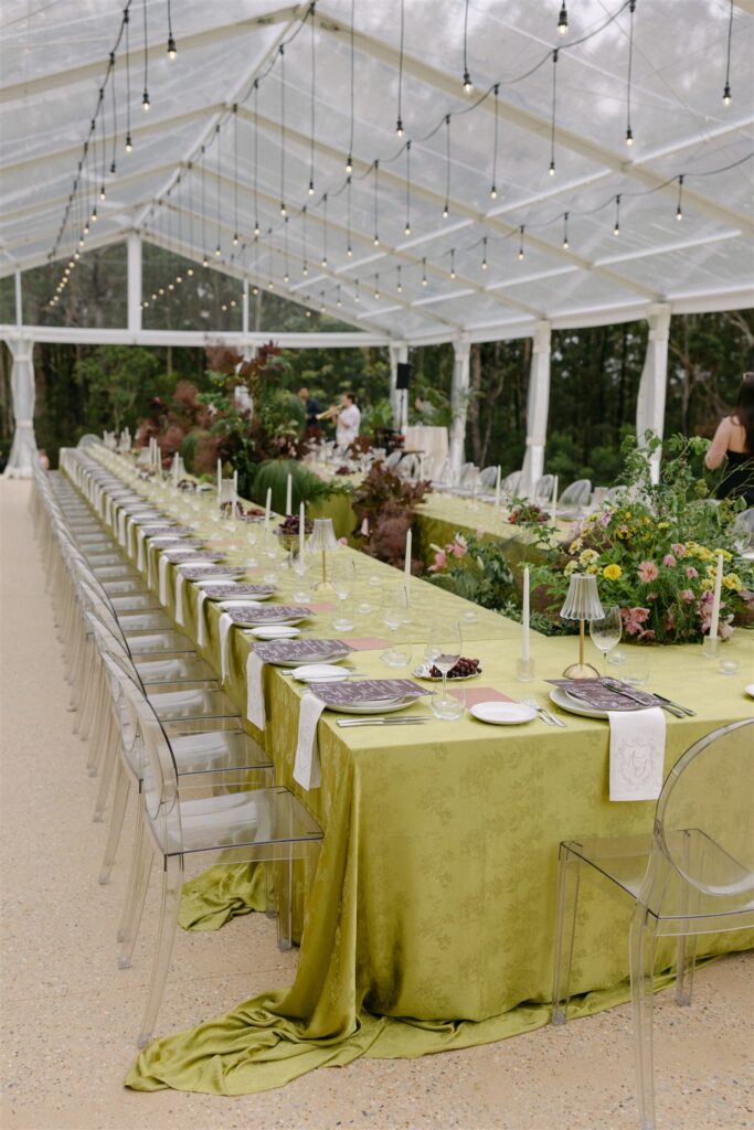 If the ceremony was drama, the reception was revelation. Held beneath a clear marquee that kept the surrounding bushland in full view, the space was built around one of my favourite design decisions of the year: chartreuse linen.
