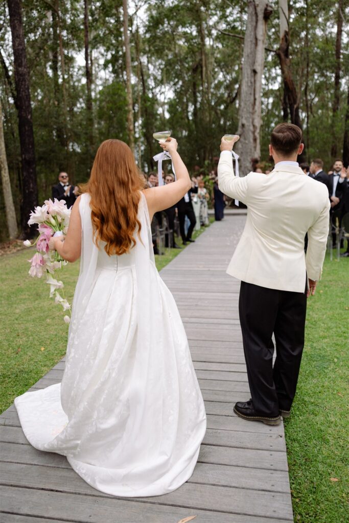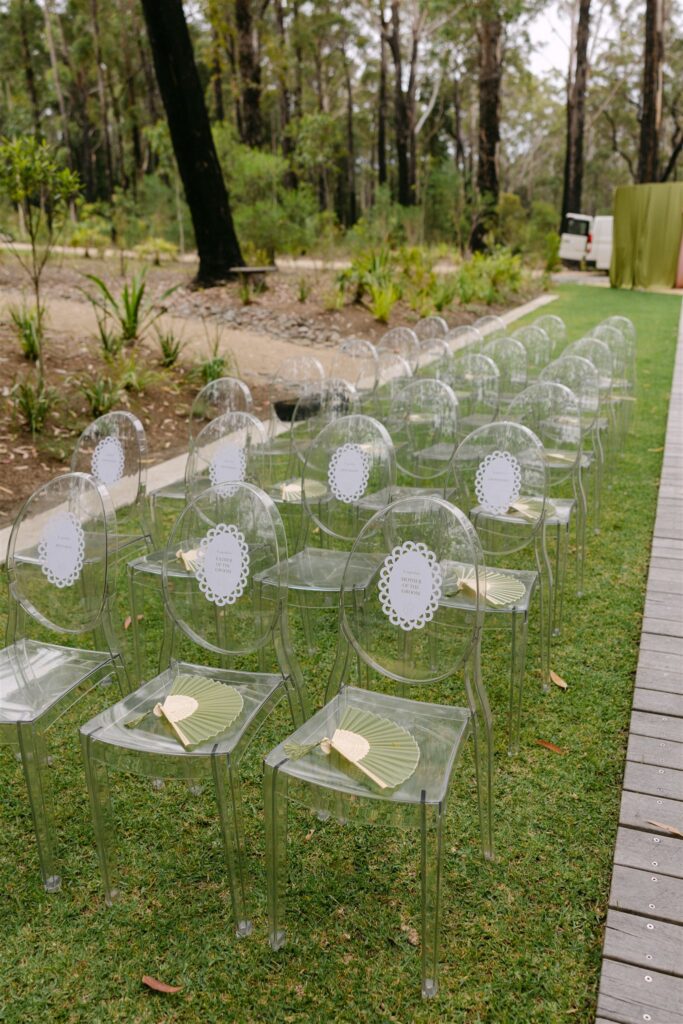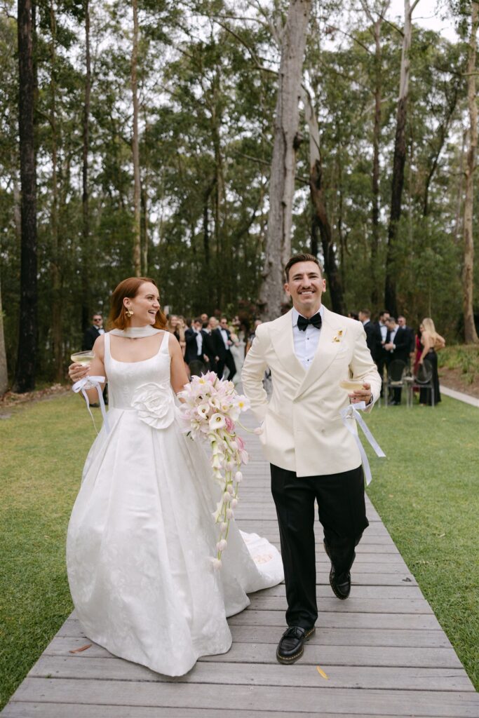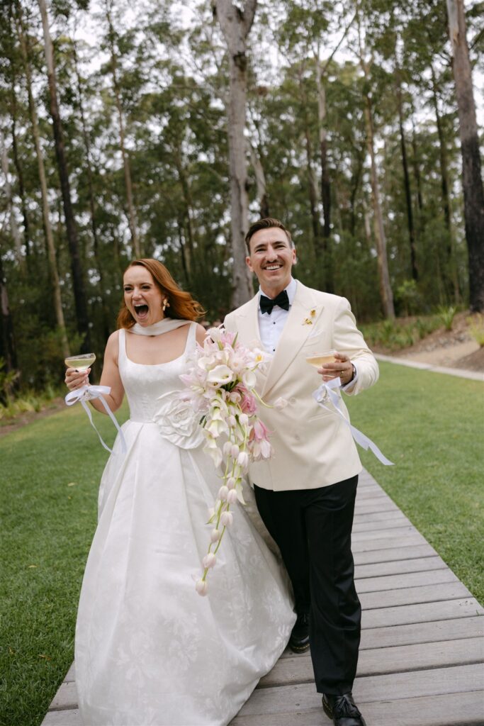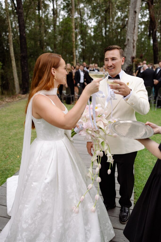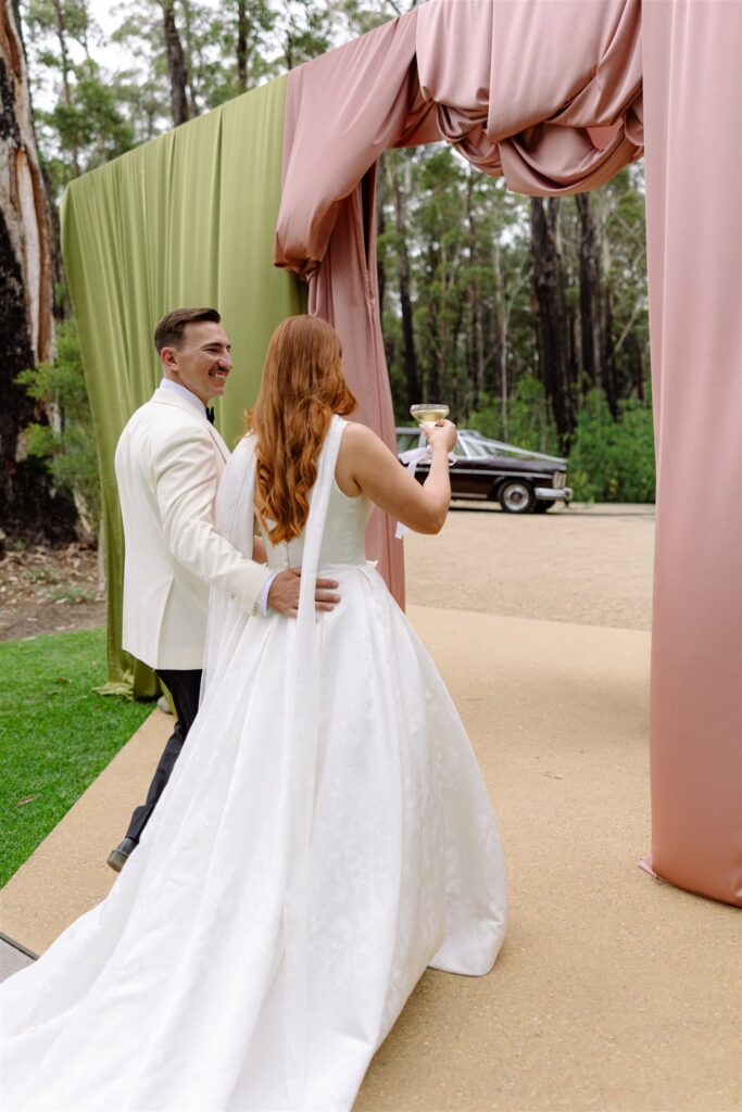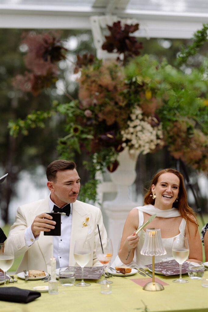 If the ceremony was drama, the reception was revelation. Held beneath a clear marquee that kept the surrounding bushland in full view, the space was built around one of my favourite design decisions of the year: chartreuse linen.