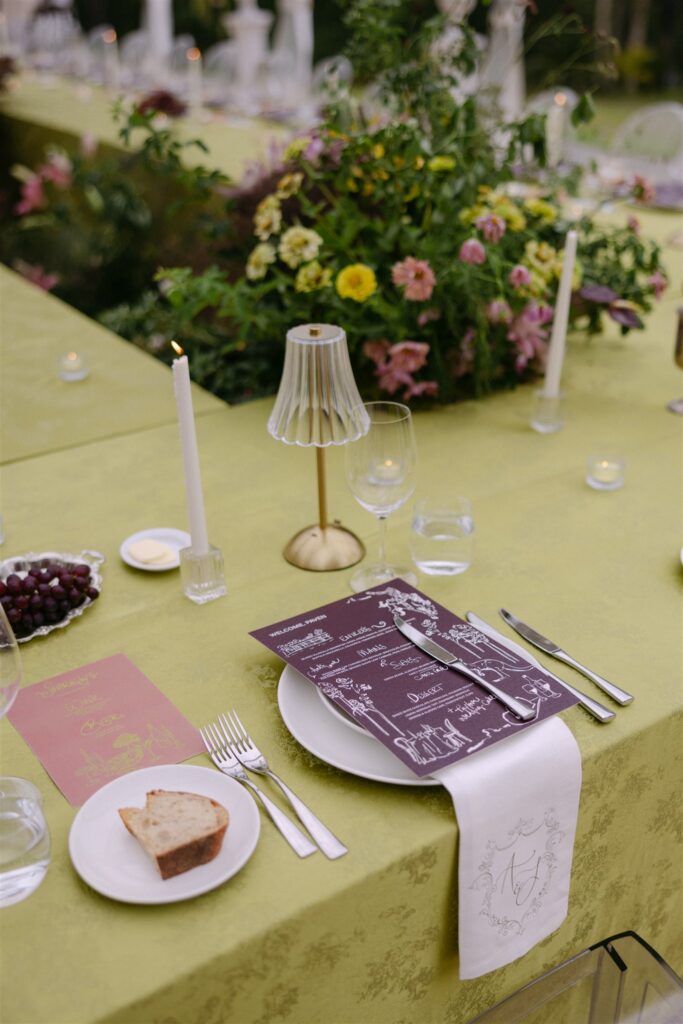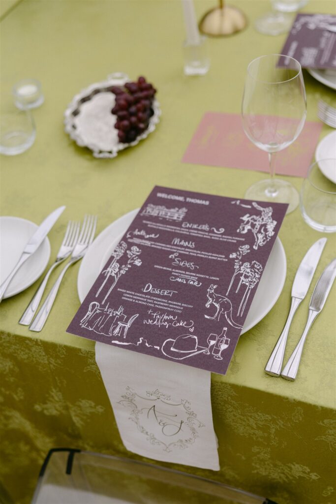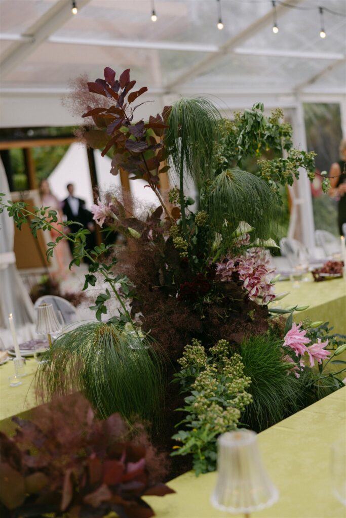 But against the deep burgundy and dusty mauve of the floral palette, it was transformative. The acid-green tone made the botanicals sing, while the clear ghost chairs and glass candleholders kept the aesthetic from tipping into heaviness. The tablescape was designed to feel like a garden growing through the centre of the room: zinnias in lime and chartreuse tumbling alongside smokebush, trailing grasses, dahlias, roses, cosmos and orchids in blush and mauve, and lush foliage spilling toward guests. Bunches of dark grapes on silverplate added texture and abundance. The illustrated plum menus sat against the linen like artwork.