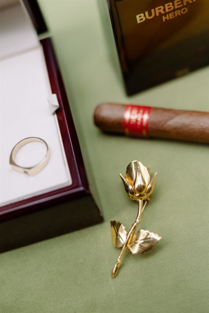 And a gown with a three-dimensional fabric rose at its centre? That calls for something equally considered, beautiful enough to stand beside it, but different enough not to duplicate it.