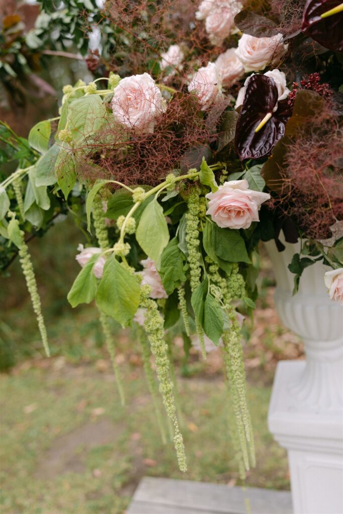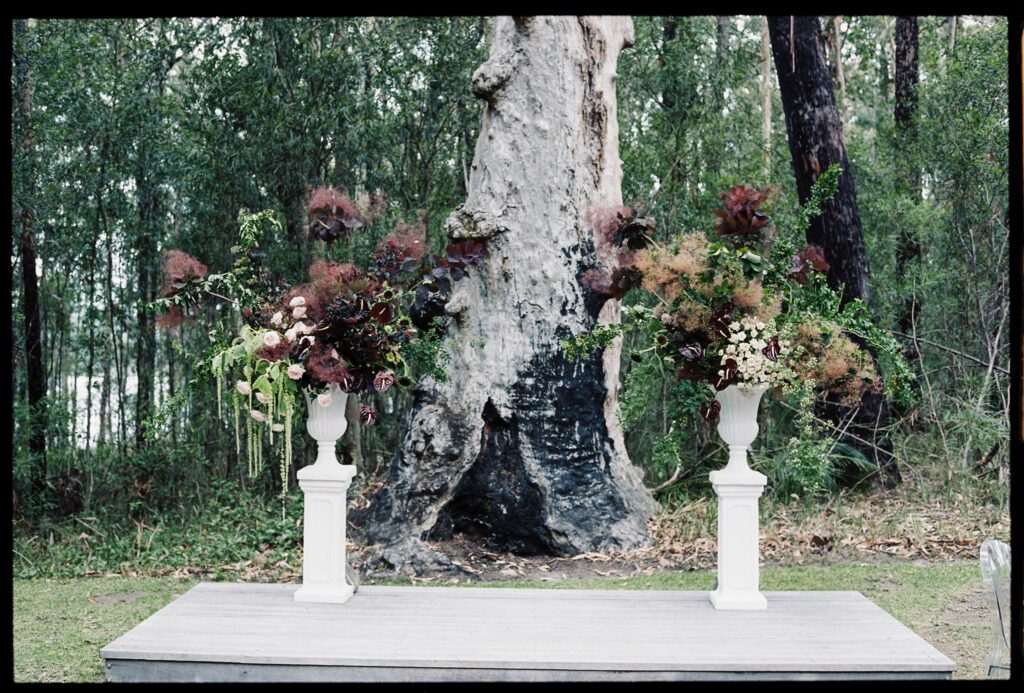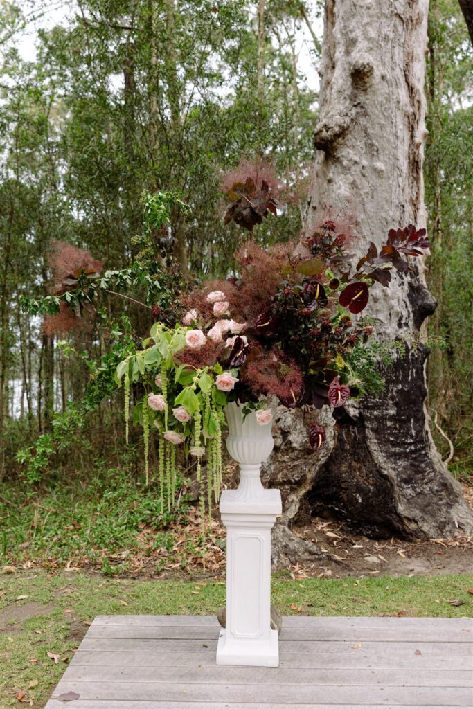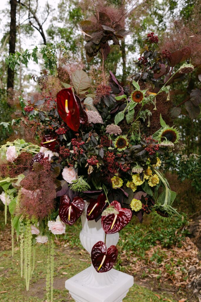 The ceremony was anchored by two grand urn arrangements on white classical plinths, positioned either side of The Jackson Ranch’s magnificent ancient gum tree. Each was built to read differently depending on angle and proximity; from a distance, an explosion of moody, textural abundance; up close, an intimate study in detail: trailing green amaranthus cascading from the urns, dark anthurium faces catching the light, blush garden roses nestled into clouds of bronze-toned smokebush, and wild foliage reaching outward as though still seeking the sky.