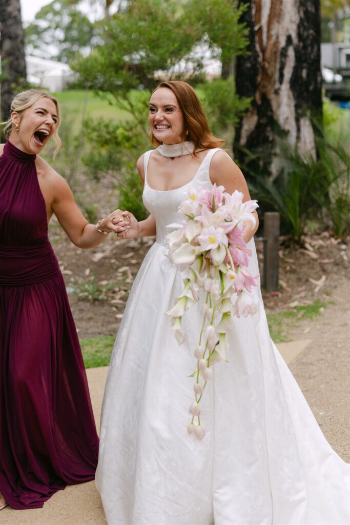 The wrist corsages, each one unique, each one designed to complement the individual gown and personality of the bridesmaid wearing it, were the final stitch that connected attire to florals and made the whole thing feel intentional from every angle.